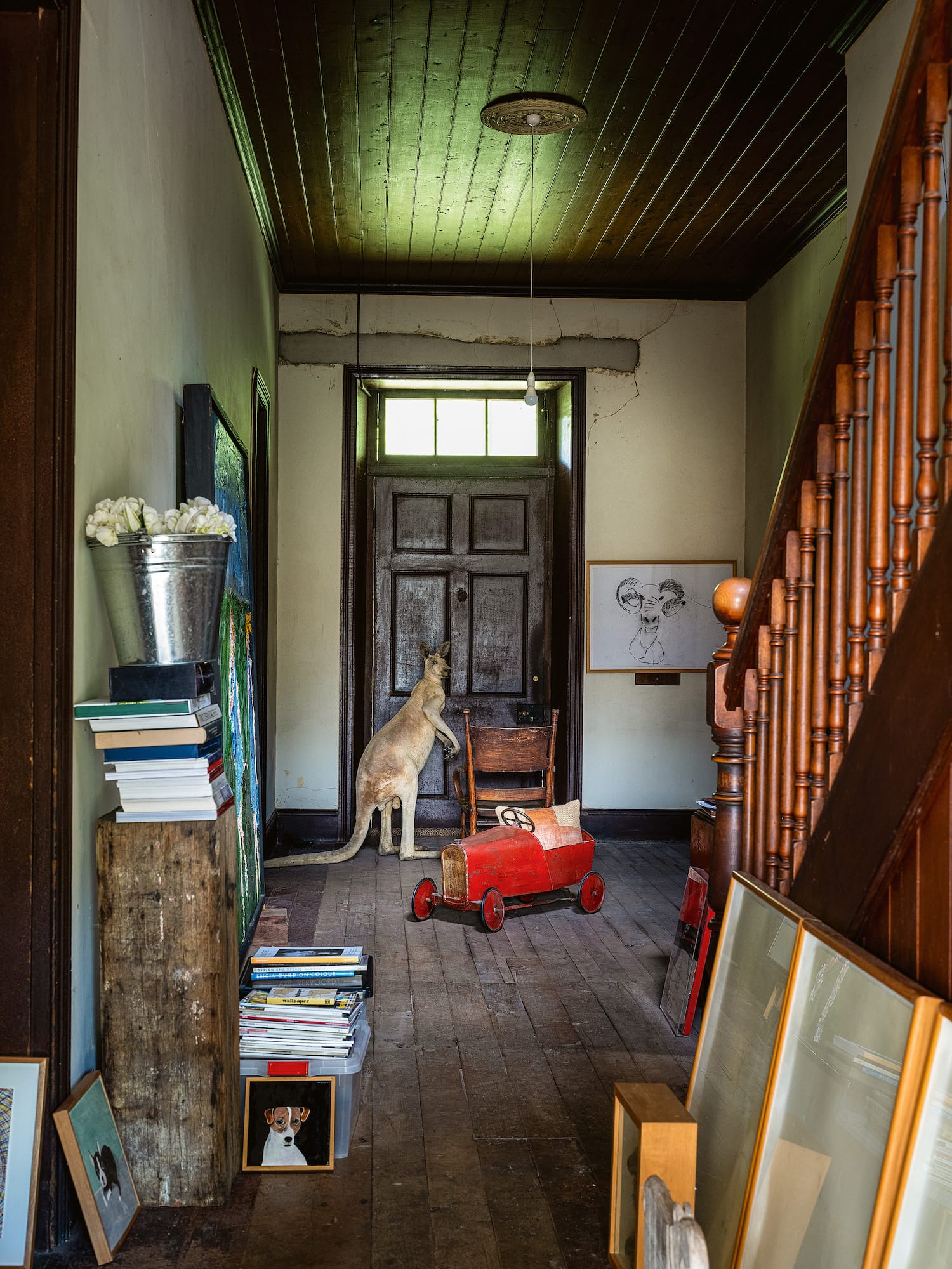 The entry hallway contains piles of books, paintings large and small, a red vintage child’s car and a life-sized stuffed kangaroo. On closer inspection, Bobadil’s original details emerge: beautifully faded Victorian woven lino; Norfolk Island pine joinery; wooden blinds made by Maitland’s Fry Bros cabinetmakers and undertakers, still in business; and unusual marbleised wood fireplaces, mingled with the couple’s scattered possessions.