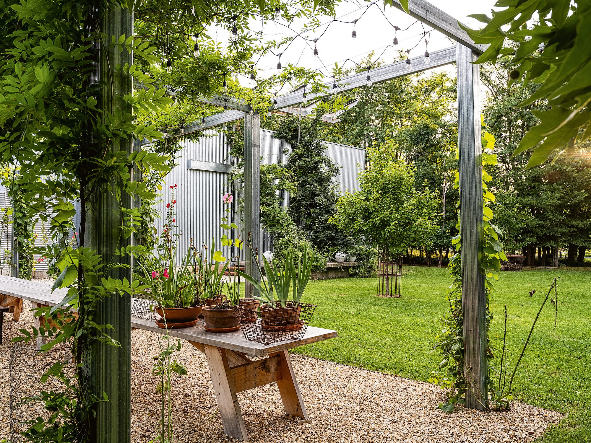 Reid has plans to turn this second gallery into a restaurant and build a larger one with highway frontage. But first he’s installing an outdoor pizza oven he designed himself. It’s inspired by the old meat safes from his childhood growing up in Narrandera and Wagga Wagga. He envisages visitors eating pizza under one of the industrial steel pergolas he has built, draped with wisteria, passionfruit and grape vines to offer shade in summer’s extreme heat.