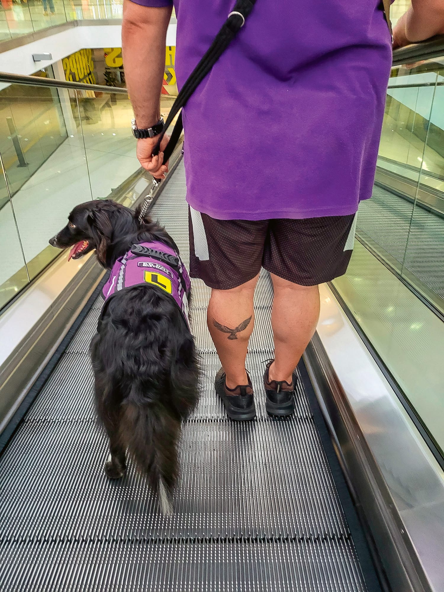 Blaze assisting his handler at a shopping centre; training session with handlers and foster dogs.