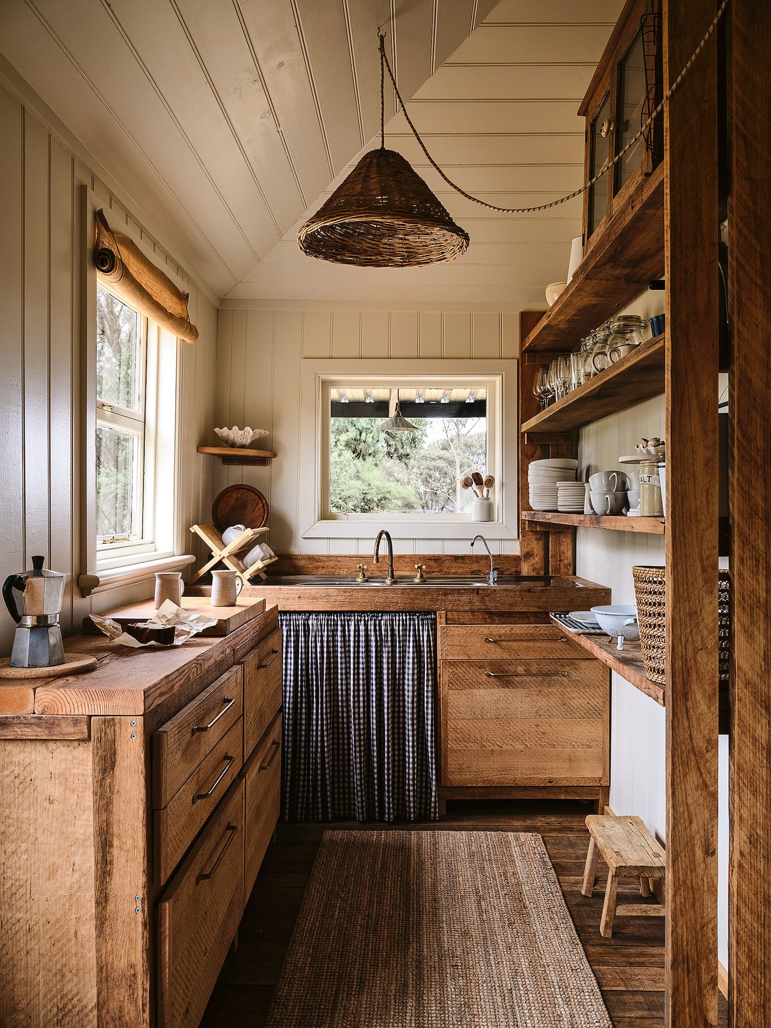 When they bought the place in 2018, the interior was a bit hectic with brown patterned carpets, a Laminex kitchen with a swirly blue lino floor, tiny windows and beer bottles insulating the walls. “A true shack,” Newman-Morris says, “with some water tanks, a tiny shed, a few hydrangeas and a few rogue plants.”
