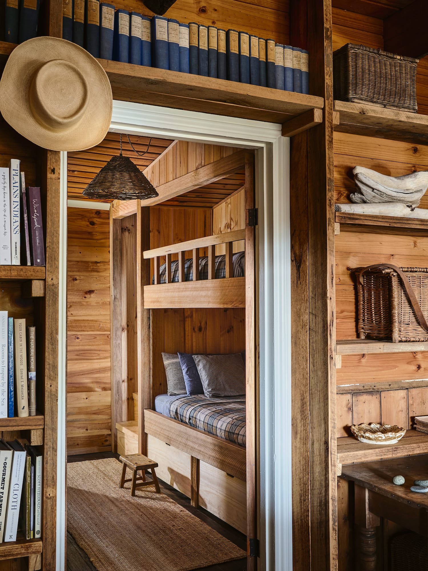 The renovation was logistically demanding, with most of the recycled timber materials, including doors, windows and flooring, brought from Victoria after Newman-Morris struggled to find suitable secondhand supplies locally. “I remember one of those first trips with Jack, his parents and me, packing two cars and one trailer with one child and everything from the timber and antique tables and chairs to life buoys and ticking cushions. We packed it so tightly and so high it was custom Tetris.”