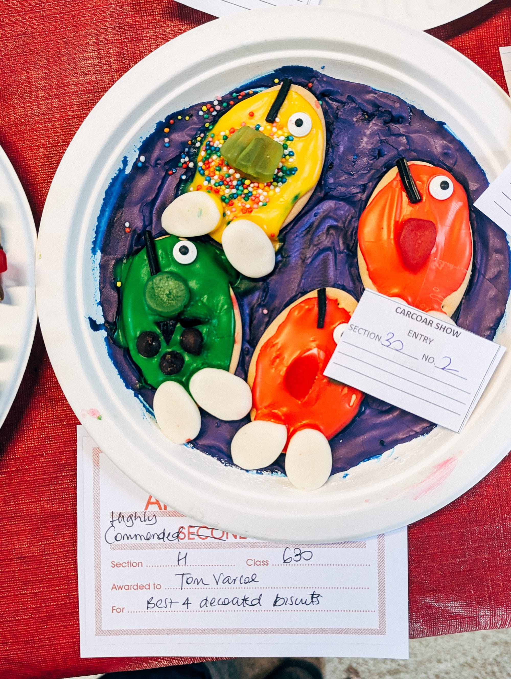 Tom also received a highly commended for Best 4 Decorated Arrowroot Biscuits (Seven Years and Under) — and Molly, 4, won. She received a prize of $5. Tom celebrated by “drinking the sea”, which consisted of eating the electric-blue icing that comprised the ocean of his fish-themed entry.