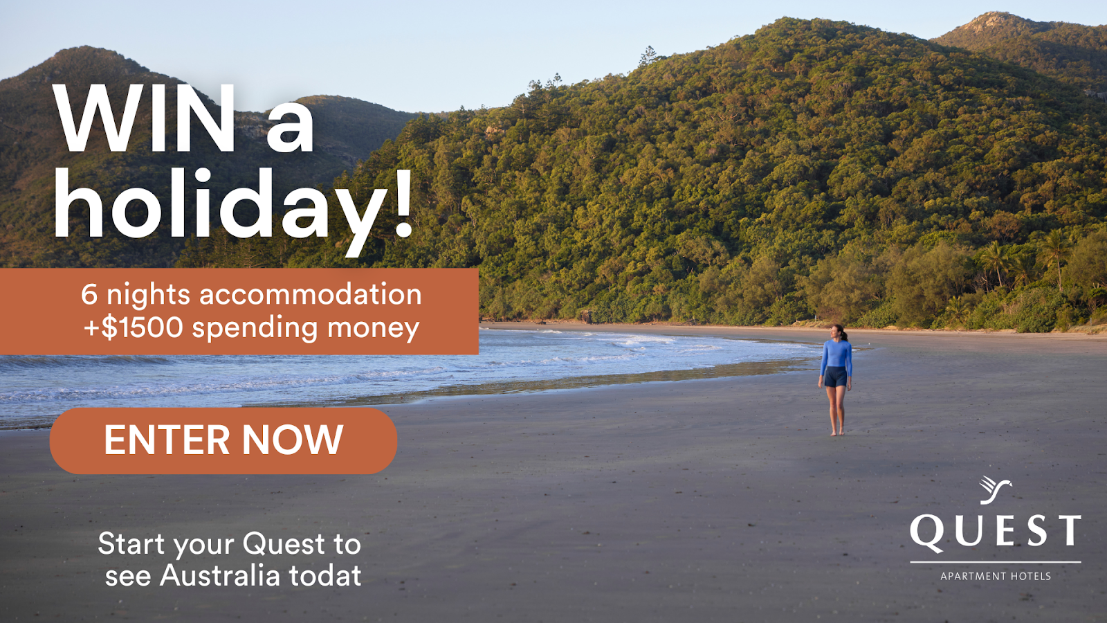 Win your very own Quest to See Australia. Imagine six nights exploring Australia, with the comforts of Quest waiting at every stop – plus $1500 to spend along the way. With a total prize valued at $5000, your ultimate road trip could be just a click away. T&Cs apply.