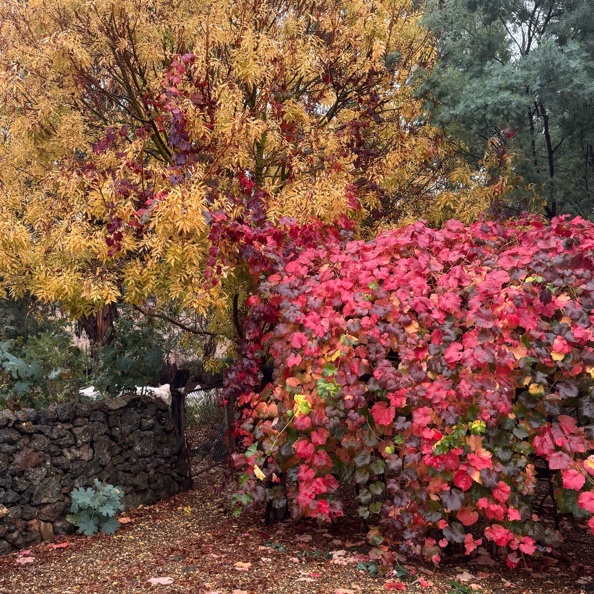 And there’s a house we pass that has a kind of Flintstones garden in-the-making, of great round river rocks arranged curiously into piles around newly planted clumps of Washingtonia robusta (fan palm) – a kind of beauty unlike anything else in Newstead.