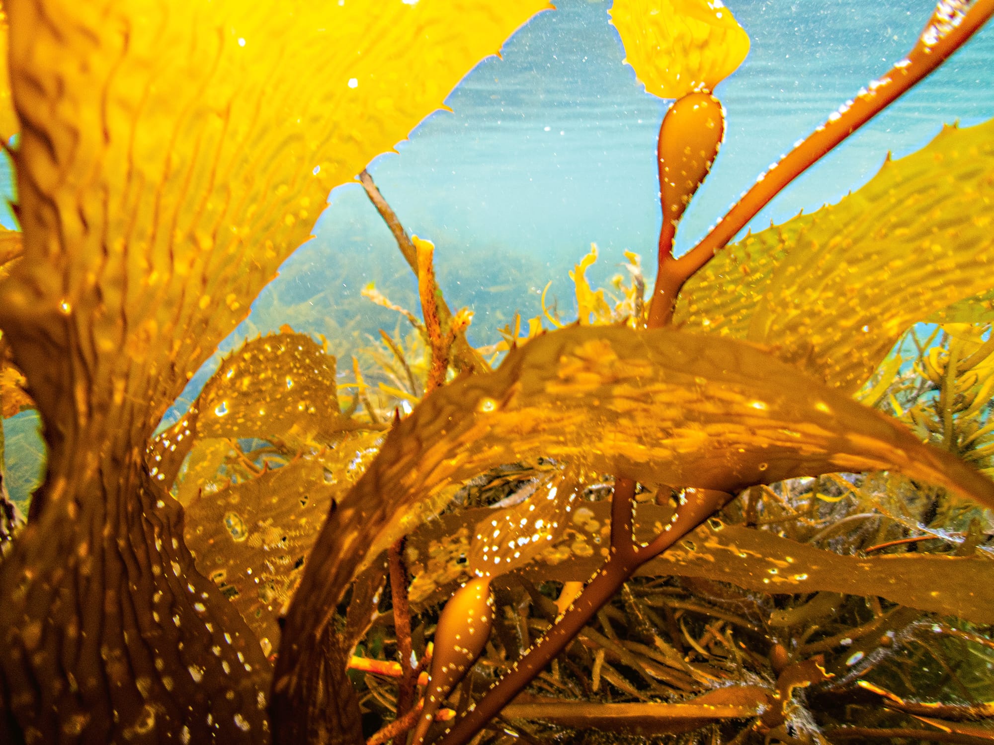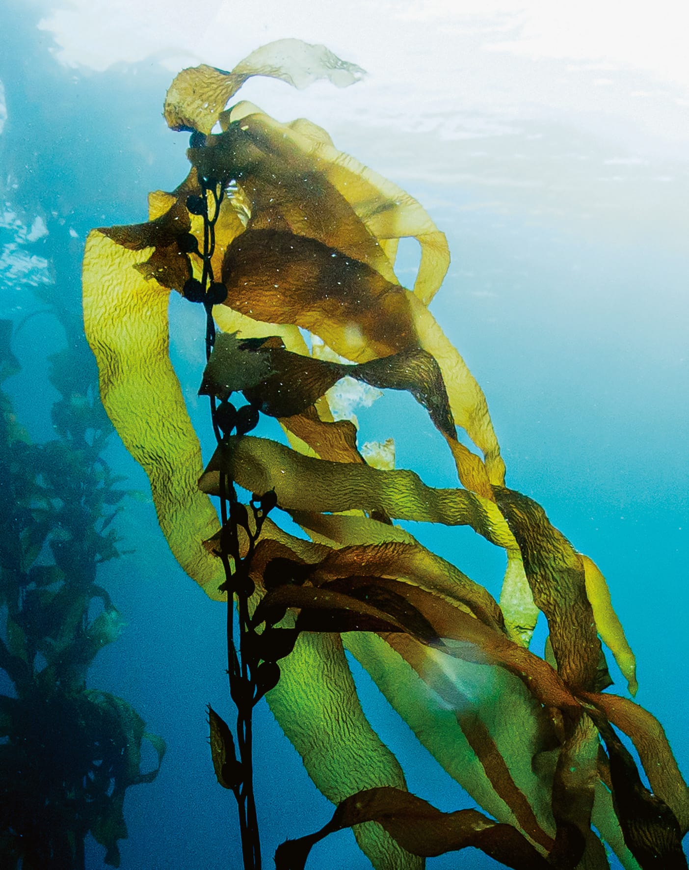 The blades (the leaf-like part) are broad and serrated to help with nutrient mixing. All kelps rely on the movement of water for a steady supply of nutrients necessary for photosynthesis and growth. They have a constant symbiotic relationship with many other species, including colonies of tiny, nutrient-gathering bryozoans, which to us appear as white calcium deposits on the stipes and blades, but under a microscope look like delicate, exotic flowers. Within a harmonised community and under healthy conditions, giant kelp can grow up to 60 centimetres a day.
