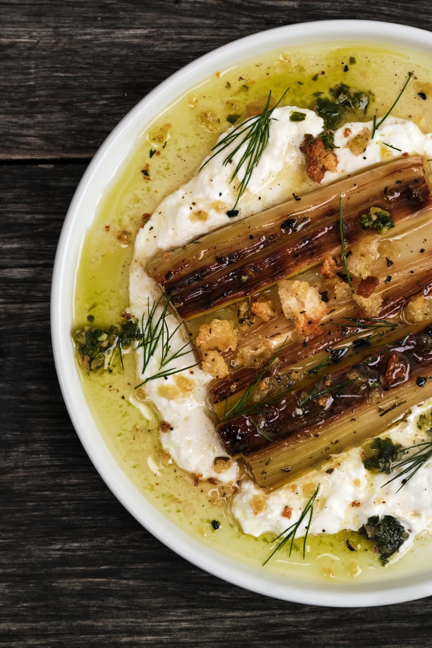 Being winter, it's all about the leek. I grow so much of it, and it's such an underrated vegetable. I use leeks as the base for a lot of soups. They're the star of one of my favourite dishes, currently on the menu as a lunch entree. Pulled fresh from the garden and cleaned up, I will char it, then slowly braise in the oven with thyme, lemon, white wine and vegetable stock. Once cooled, it's plated on a bed of stracciatella, drizzled with a mustard base vinaigrette, parsley oil, fresh dill, pangrattato and rye crostini. It just dances on your palate, and the leek is the hero, which is how it should be.