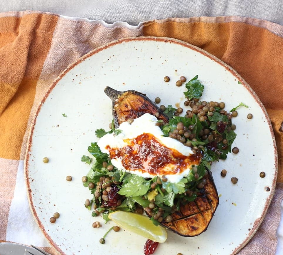 Harissa-roasted eggplant with herb lentils—it's so wholesome. The lentil salad is amazing, but the real hero is the eggplant. I just love how versatile this vegetable can be: either on an open flame making smoky baba ghanoush (which we do every summer here with a lamb shoulder) or roasted with some seasoning. It's so comforting and complex. We make our own HAUS harissa, but store-bought is also fine.