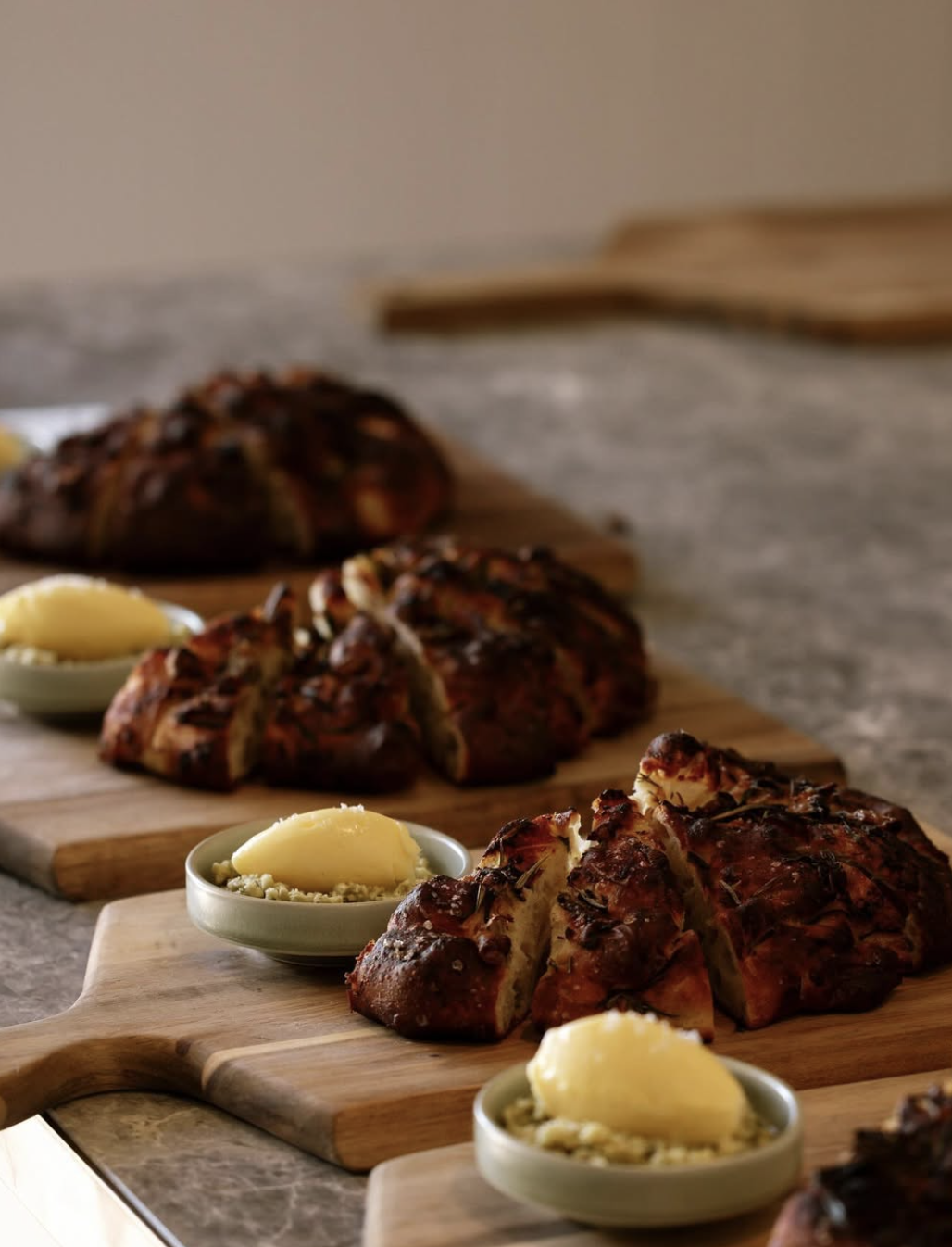 Preheat your oven to 220 degrees fan-forced. Allow your loaf to prove again on the baking paper. After about an hour, gently press the saltbush and garlic oil mixture into the top of your loaf. Bubbles should rise and form around the saltbush, creating pockets that embrace the gooey garlic.