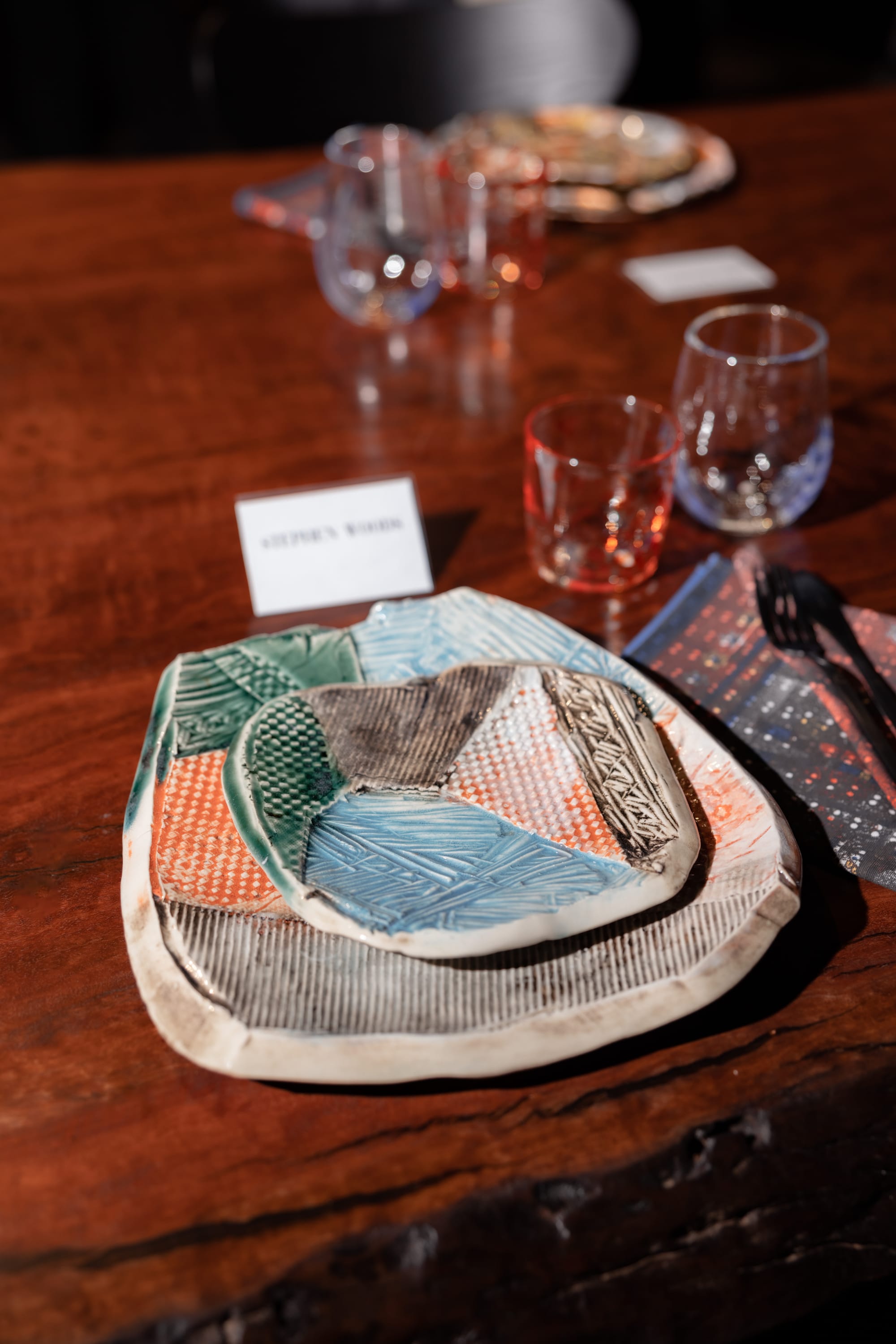In brief, here's how it works: Douglas and Dan create a menu for a group of tables and on each table is a handmade setting by local potters and makers. At the end of the meal, diners get to take home the plate the food was served on, the glass they drank from and the cutlery they used.