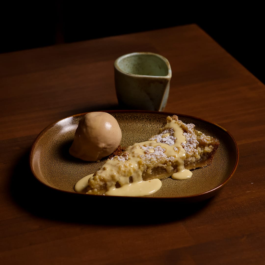 Place a slice of the tart onto a plate and dust it with a little cinnamon icing sugar, accompanied by the warm anglaise. In the restaurant, we accompany it with a brown sugar and nutmeg ice cream.