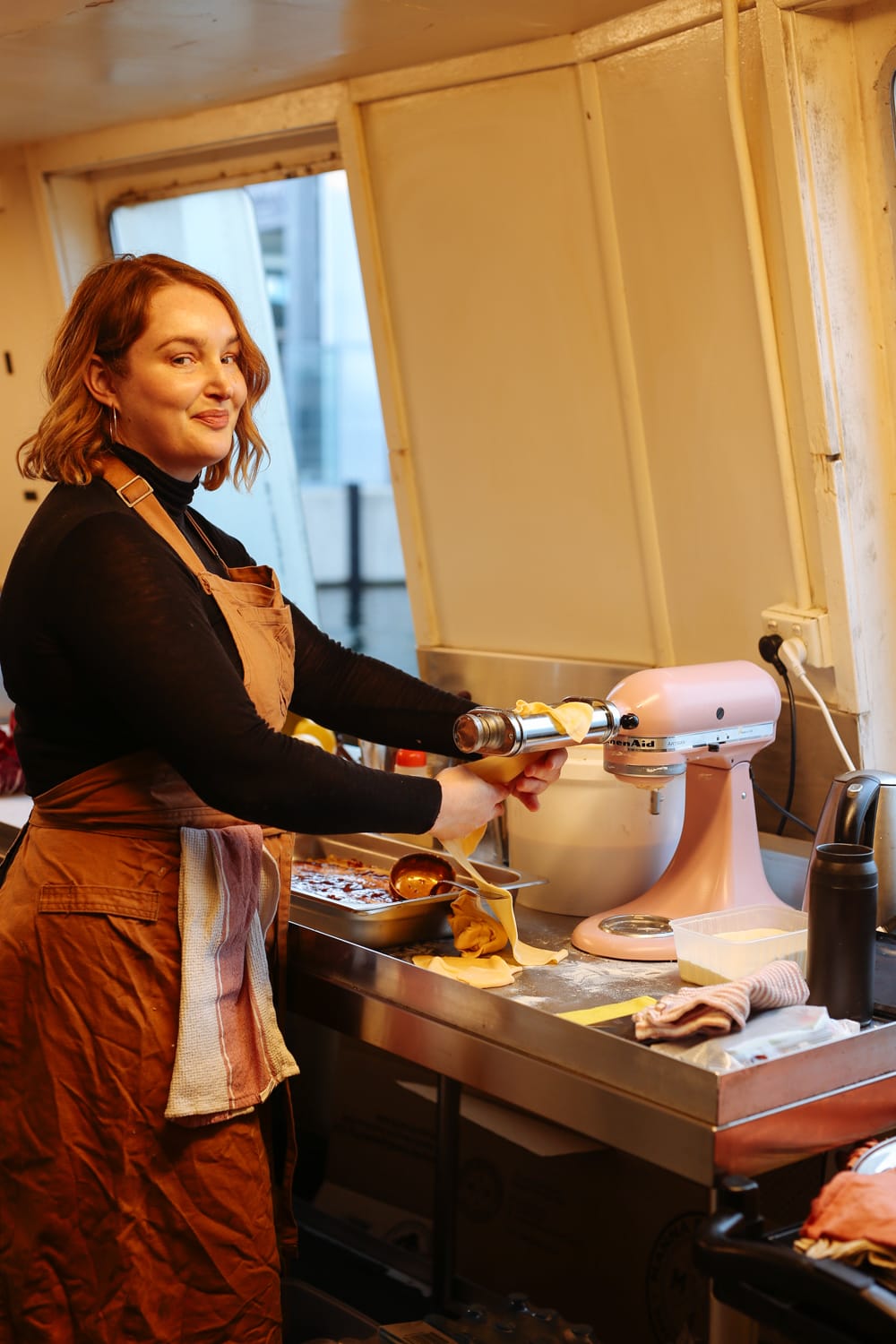 It was Natty Waves, a floating pop-up with chef Jamie Yates in the bow/kitchen. Guests come on board for a three-hour cruise along the Derwent at twilight; dolphins often romp alongside the boat, and in the little kitchen down below you'll find our chef rolling out fresh pasta for her lasagne, dimpling focaccia, slicing charcuterie and plating up with olives for pass around entrees. And then, after service, maybe she'll jump on the decks to spin a tune or two.