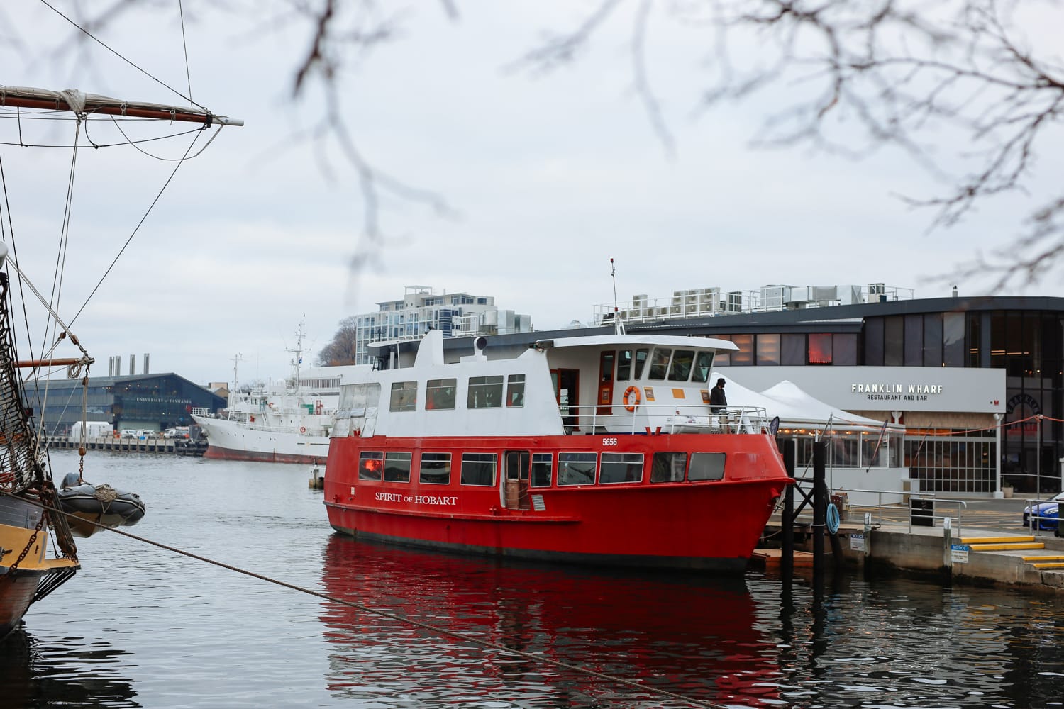 It was June 2023, and I was in town for Dark Mofo festival, at the cafe having an excellent chicken pie for lunch. Through the glass wall at the front of the cafe I see this woman standing on the prow of a big red boat tied to the dock opposite. Like in the photos here (taken in June 2024), she was aproned up, a towel folded through the waist tie, waving to a stream of rugged up, fancy-dressed people crossing the gangplank onto this party boat of party boats. I could see a DJ through the lower deck portholes. It all looked very fun and very 'Tasmanian'.